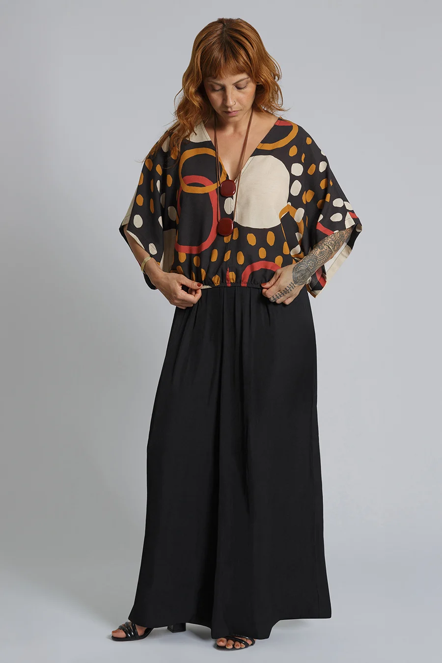 Blusa cropped preta com mangas amplas e abertura nas costas. Sua estampa orgânica torna a peça única e moderna. Confeccionada em Viscolinho (um tecido que une a beleza do linho com o conforto da viscose).